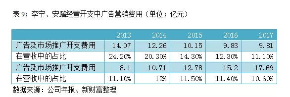 在踏实赚到钱之后,安踏近年在广告营销上的费用逐渐提升,2017年达到了17.69亿元;而李宁的广告营销费用在控制下逐渐下降,2017年已经下降到了9.81亿元,在营收中的占比从2013年的24.2%下降到了9.81%(表9)。