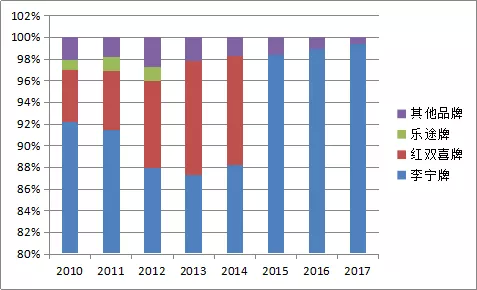 图3:2010-2017年按品牌划分的李宁营收构成