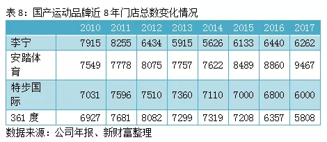 李宁公司跌落的主因虽然是其本身的战略失误、模式弊端、多品牌策略进展迟缓,但客观上与整个行业寒冬的大环境也不无关系。2012年开始,中国体育运动市场步入寒冬,行业重新洗牌,大量本土品牌大范围收缩门店、清理库存,出现了不同程度的“关店潮”;李宁门店数量也由 2011年的8255家迅速减少至2014年的5626家(表8)。