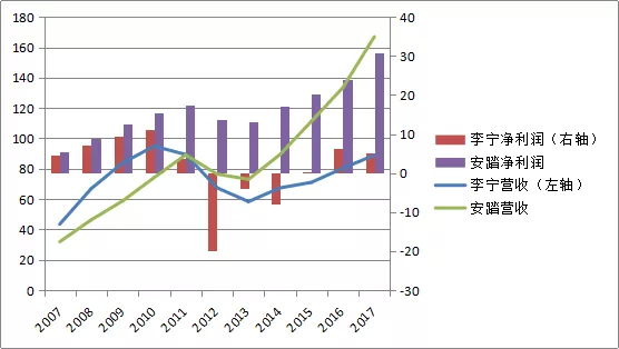 2018年半年报显示,李宁实现收入47.13亿元,同比增长17.9%;净利润同比增长42%至2.69亿元,净利润增长幅度超过安踏。