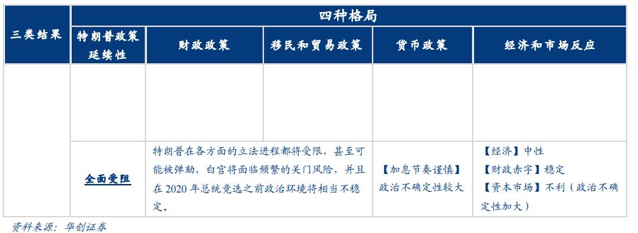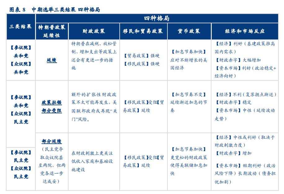 如果民主党夺得众议院且两党未达成妥协,那么特朗普政策料将部分受阻。我们或将看到中性的财政政策(额 外的扩张性财政政策被驳回,政府面临关门风险)+渐近收紧的货币政策(渐近式加息)+放松的移民政策和延 续的贸易政策。在没有额外刺激的政策下,随着美国利率的上行,经济的复苏拐点渐近,资本市场短期延续波动。