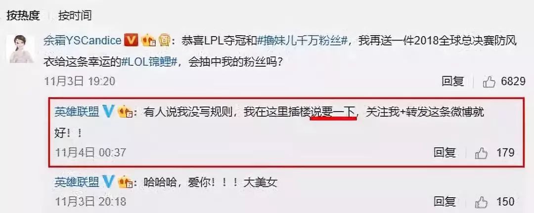 IG夺冠当日,英雄联盟官方微博就发布了庆祝IG夺冠给粉丝抽奖福利的活动。但细心的网友发现,这条微博粗糙到没有写参与抽奖的方式,直到11月4日,意识到问题的官博在首条评论里留下活动规则。