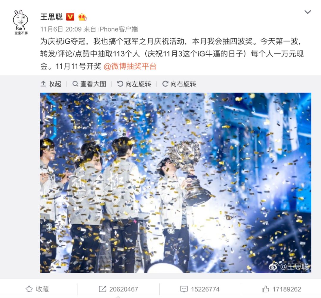 IG夺冠后,王思聪的热度持续上升,最新的一条抽奖微博更是让他步入了顶级流量行列。