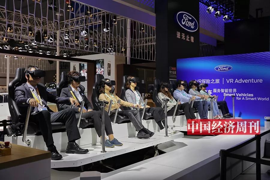 在福特展区的VR 体验展台,来宾戴上眼镜后,眼前会出现福特最新的技术介绍,通过沉浸式视觉体验了解福特在车辆联网通信技术领域的最新应用。
