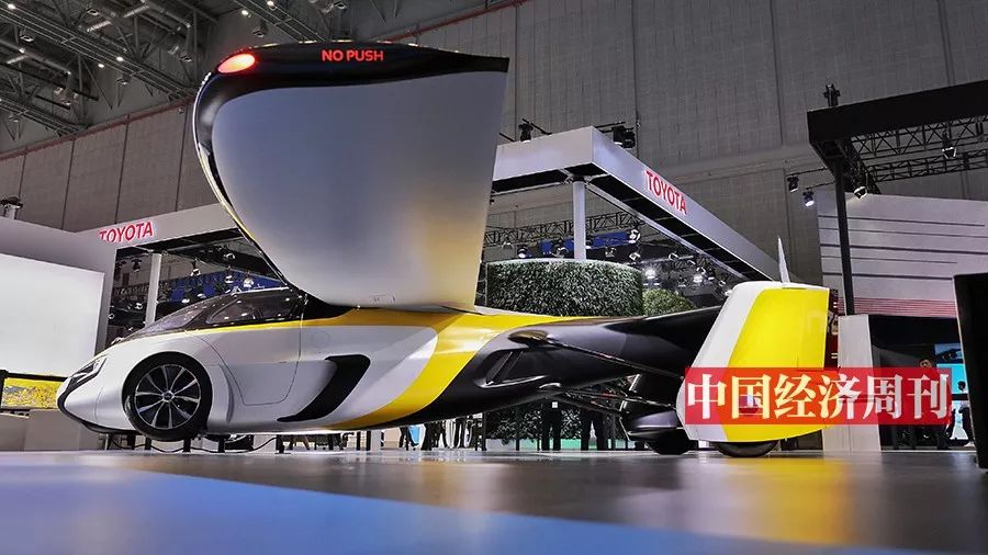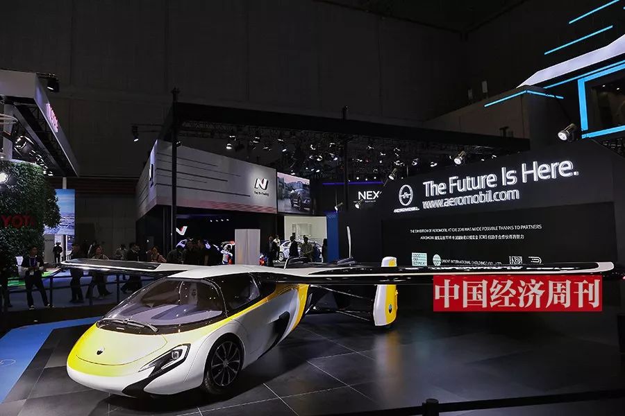 在“The Future Is Here”的巨大标语下,黄白相间的Aeromobil 正在酷炫变身。从