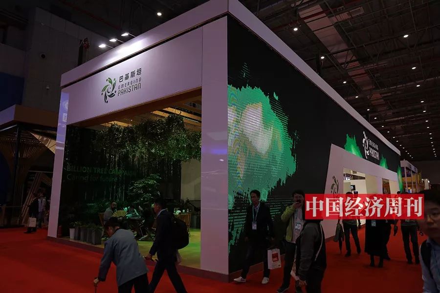 巴基斯坦展馆内,一盆盆绿植挂满展区上方的木架,象征着其参与的“十亿棵树种植计划”。