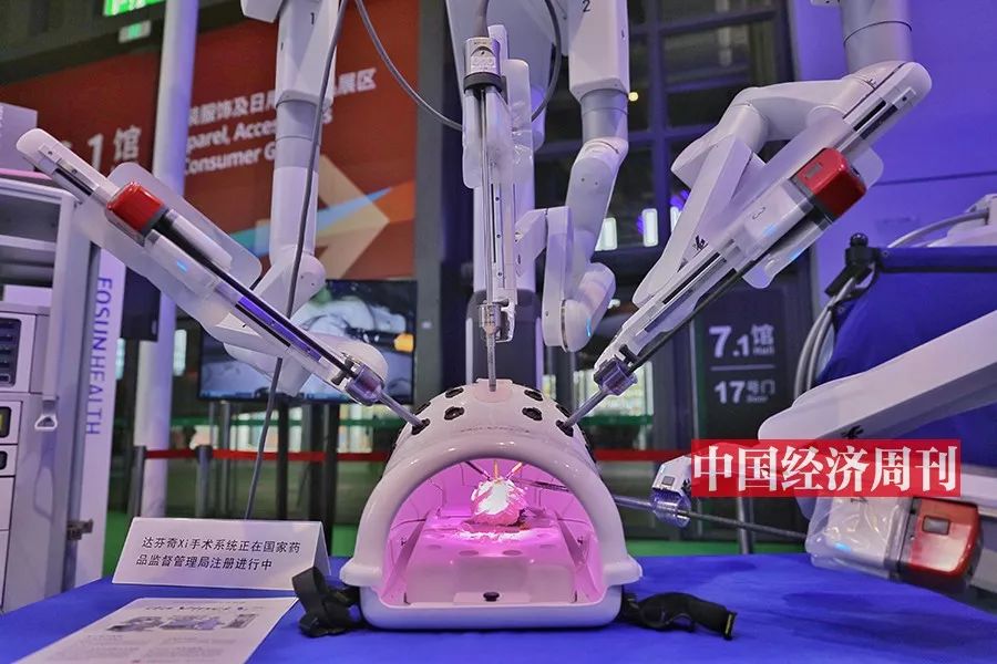 达芬奇手术系统是当今外科领域先进的高科技产品,代表了微创外科的发展方向。通过机器手臂的协助,外科医师只要坐在控制台,看着手术部位的三度空间影像,即可遥控机器人手臂,还可避免人手颤抖的情形。该机器人精确到可以在不触碰其他花蕊的情况下,将一根细小的花蕊轻松剪断。本届进博会期间,共有来自北京、贵州等多个省市的21 家三级甲等医院与达芬奇手术机器人达成了金额超过6000万美元的采购意向。