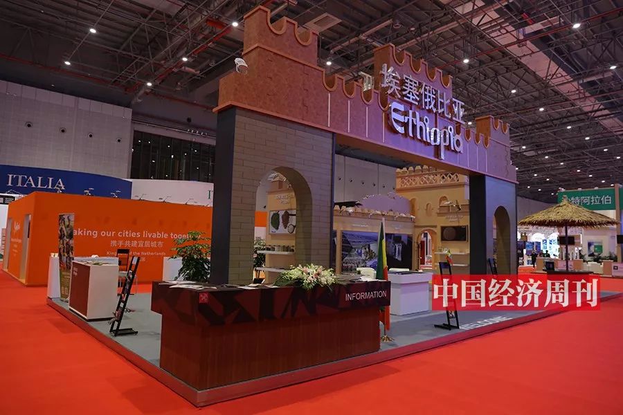 埃塞俄比亚不仅将本国特色的咖啡带到了中国国际进口博览会上,同时也用极具国家特色的建筑风格来装饰自己国家展区。