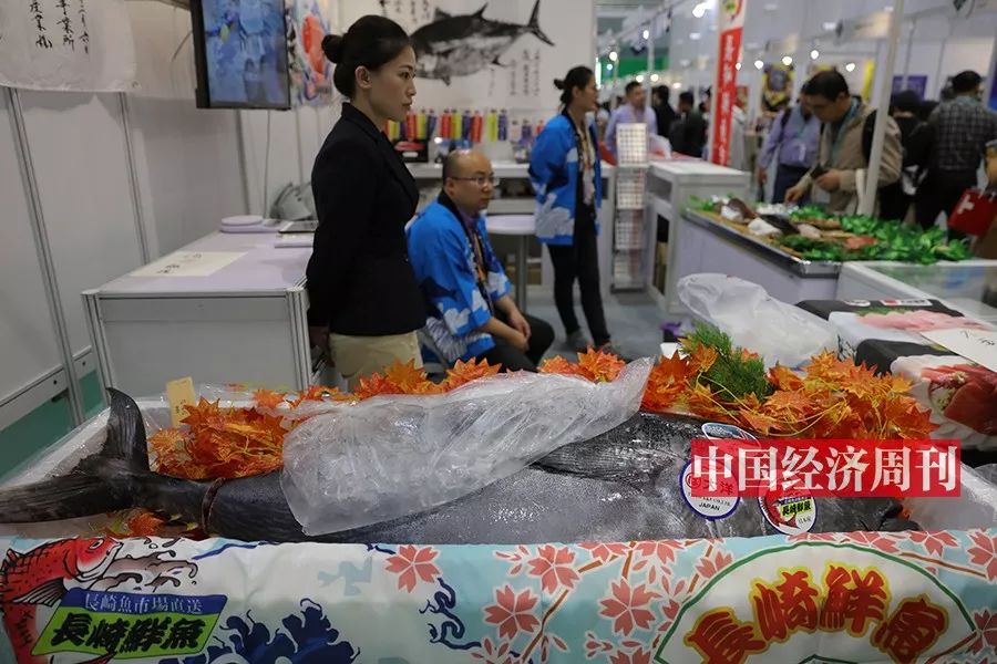 这条金枪鱼是由长崎鱼市株式会社带来的。与其他展位不太一样,他们的展位上摆满了各类海鲜。当然,最惹眼的就是这条1.2 米长、重60 余公斤的蓝鳍金枪鱼。11 月8 日下午,金枪鱼解体秀上演,并且免费发放了200 份试吃。观众们同时满足了眼福和口福,纷纷大呼过瘾。