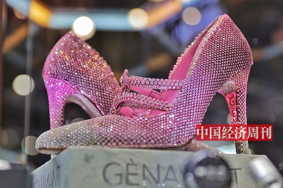 在此次进博会上,最昂贵的消费产品莫过于价值3000 万人民币的粉色钻石高跟鞋“春灿”,该珠宝鞋鞋体由4 颗1 克拉主石、超1 万颗共计300 克拉的粉红钻石雕琢而成,这些钻石的手工镶嵌花费了360 个小时。