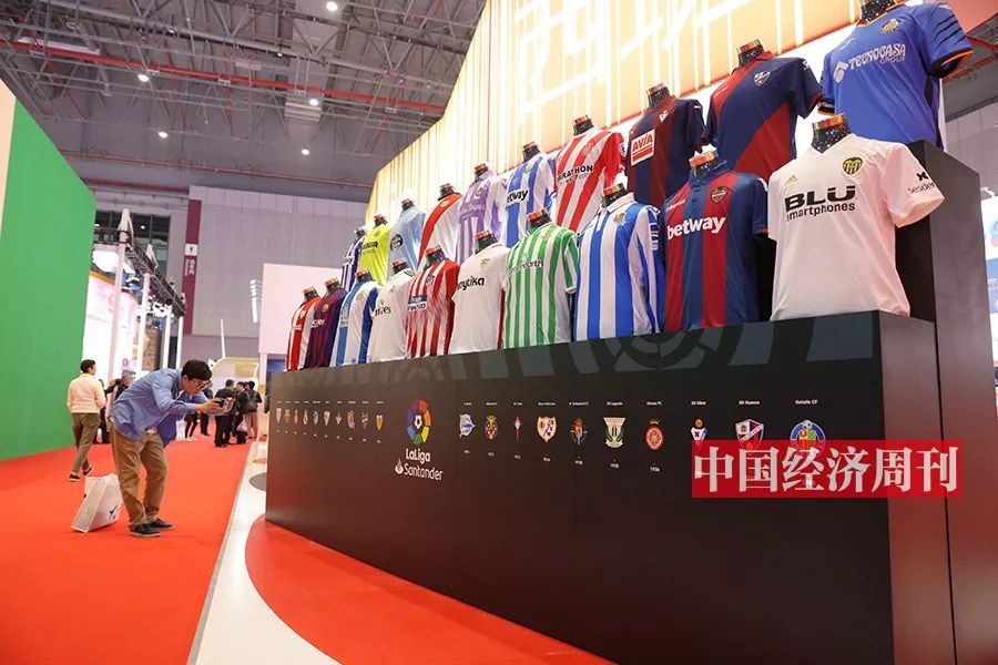 西班牙展馆,巨大的陈列台上列出了西甲联赛20 家足球俱乐部的球衣。