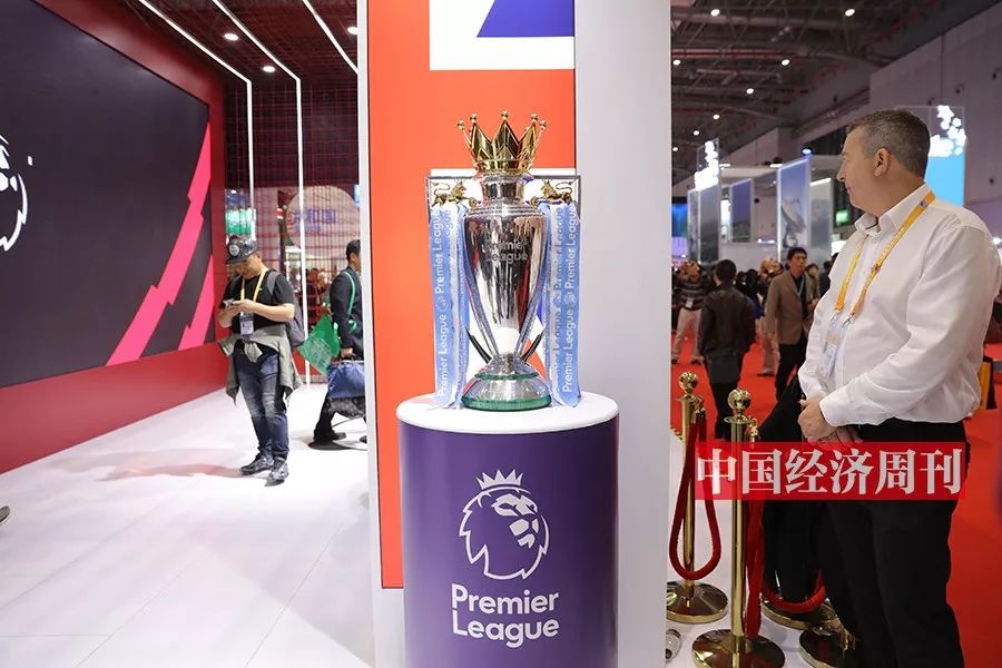 在英国国家展馆门口,头顶金冠的巴克莱杯——英超联赛冠军奖杯吸引了众多观众上前与其合影。