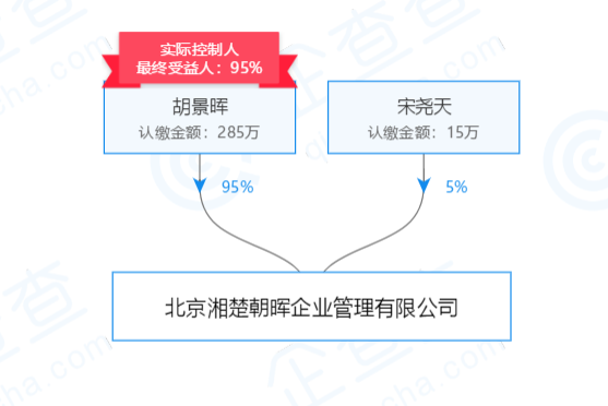 据企查查显示,湘楚朝晖集团于2018年11月1日成立,目前处于开业状态。胡景晖任经理和执行董事,宋天尧任监事。公司注册资金为300万元人民币,其中胡景晖出资285万元,持有公司95%股份;自然人宋尧天出资15万元,持有公司5%股权。