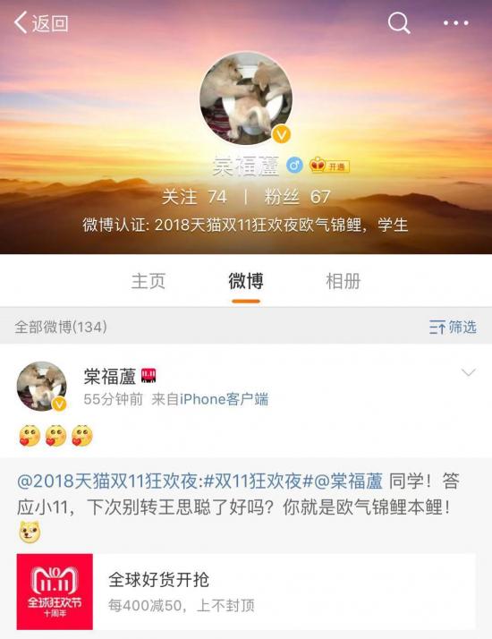 而天猫双11狂欢夜之后,这个“魔咒”被正式打破!宝箱开出后的第一时间,客服便联系到了这位幸运鹅,“半**蔑”是一位来自福建的00后男生,微博昵称“棠福蘆(lú)”。划重点,男生!谁说锦鲤不能是男性,“欧气锦鲤”就是!