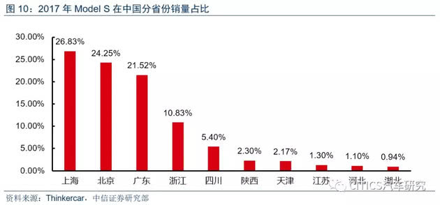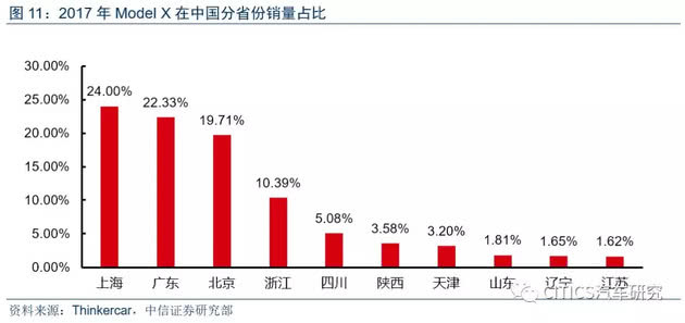 分省份来看,沪京粤浙川排名前五。2017年,上海(4471)、广东(3919)、北京(3827)、浙江(1881)、四川(927)为特斯拉销量排名前五的省份。之后销量较高的城市还包括:陕西、天津、江苏、山东和湖北。