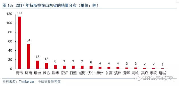 以江苏省和山东省为例,2017年特斯拉销量已经遍及山东的17个地级市和江苏的13个地级市,但销量主要集中在省内的经济发达城市(苏州、南京、无锡、青岛、济南)。