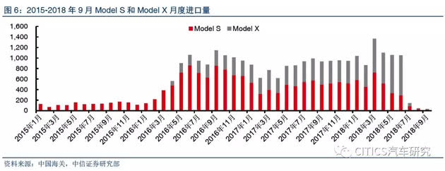 根据中国海关数据,中国特斯拉的进口量从2016年3月起明显增加,从此前的月均百余台增加到千余台,之后一直长期维持在月进口800-1000辆的水平。车型结构来看,Model X月度占比接近四成,Model S占比接近六成。自7月6日起,由于中国对美国进口汽车实行额外加征25%的关税,因此三季度特斯拉在中国的进口量大减,7月、8月、9月仅为145、46、35辆。