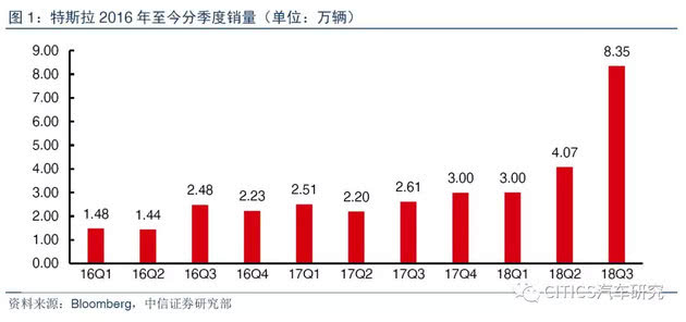特斯拉18Q3季度销量环比+105%,超级工厂明显提速。18Q3,公司单季度销量达到创记录的8.35万辆,同比+220%,环比增长105%,环比增速大幅提高的主要原因是本季度Model 3车型爬坡顺利:7-9月,Model 3在美国销量分别为1.4/1.6/2.4万辆。此前8个季度,公司受制于产能瓶颈,季度销量始终在2-4万辆区间。
