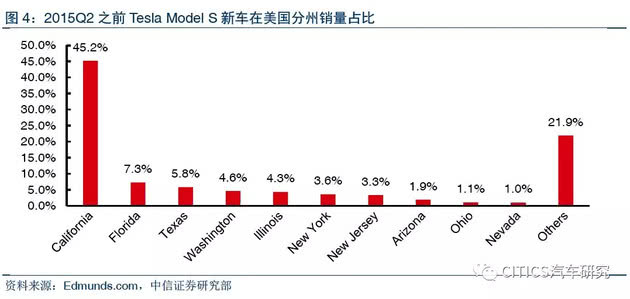 根据Edmunds的数据,2015Q2之前,特斯拉Model S的新车前四大销售州主要是气温较高的地区,其中加州占据绝对多数:加州(45.2%)、佛罗里达(7.3%)、德州(5.8%)、华盛顿州(4.6%)。伊利诺伊(4.3%)、纽约州(3.6%)、新泽西(3.3%)等冬季比较寒冷的地区销量占比位列5-7位。
