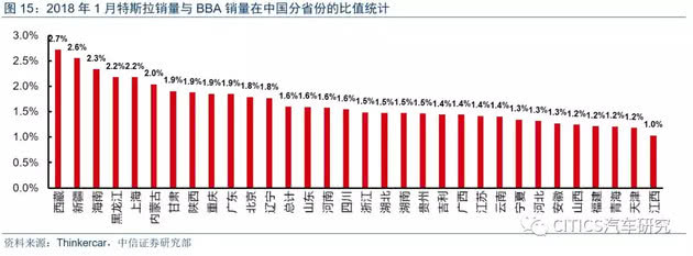 以2018年1月数据为例,中国的特斯拉/BBA比值在各省份相差不大,中位数为1.5%,平均值为1.6%。其中西藏、新疆、黑龙江、海南等地由于BBA基数较低的原因,比值反而位列前四名。特斯拉销量较高的上海(2.2%)、广东(1.9%)、北京(1.8%)的比值水平略高于全国平均水平。