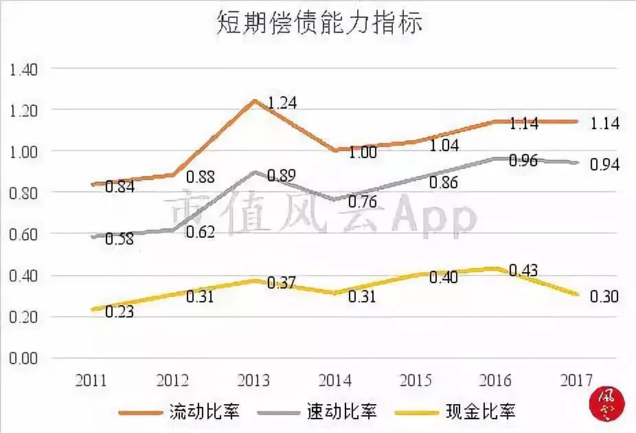 2017年,公司的流动比率、速动比率、现金比率分别为1.14、0.94、0.3,整体表现良好。公司目前不存在偿债风险。