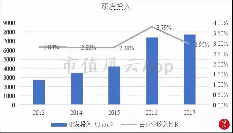 历年财报数据显示,自2013年起,公司对产品的研发投入不断增加,其中2016年研发投入同比增幅达到了75%。尽管2017年研发投入同比增速大幅下降,但其占总营业收入的比重依然在3%左右,表现较为稳定。