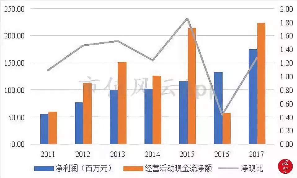2017年公司的经营活动现金流为2.23亿人民币,同比增加288%;经营活动现金流净额与净利润的比值为1.27,与去年相比,该年净利润的含金量大幅增加,获得现金的能力有所增强。