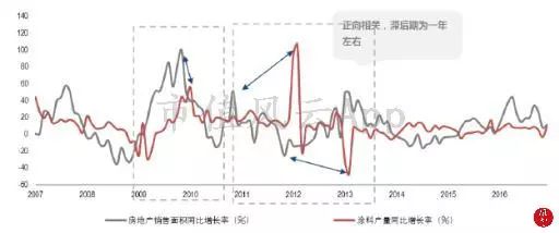 据2006-2016年的历史数据,涂料的销量增长率与房地产的销售面积增长率之间呈现一定的正相关关系,但有大约1年的滞后期。主要原因是因商品房销售一般采用预售形式,在商品房未建好之前即开始对外销售,所以从销售到装修需要一定的时间。