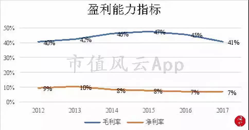 2015年后,公司的毛利率开始逐年下降。2017年毛利率为41%,同比减少了4个百分点。