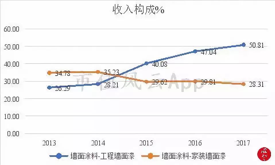 可以看到,2017年工程墙面漆的收入占比为50.81%,同比增加了3.77个百分点,而家装墙面漆的收入占比为28.31%,同比下降1.5个百分点。