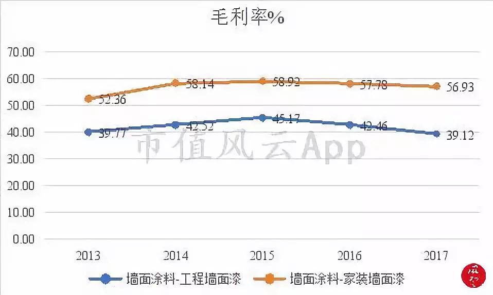 2012年至2015年,公司的毛利率从40%逐渐上升至47%,获得了持续稳步的增长,主要得益于房地产行业的快速发展,对家装涂料产品的需求增加。