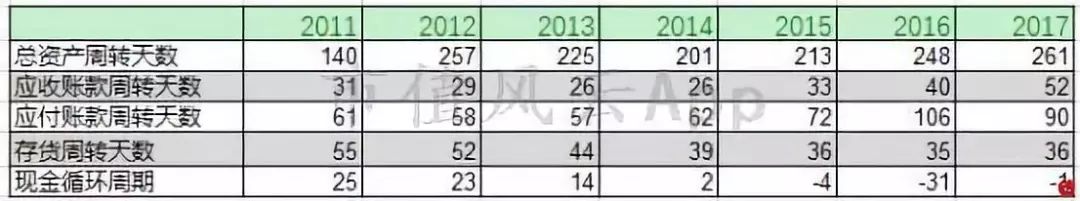 综合来看,2015年至2017年,公司现金循环周期均为负,意味着公司的主要经营活动不需要垫资即能正常运转,反映公司运营效率高。