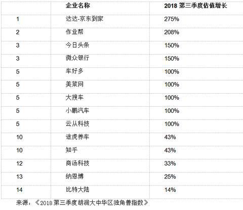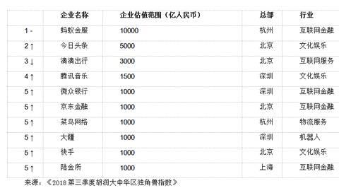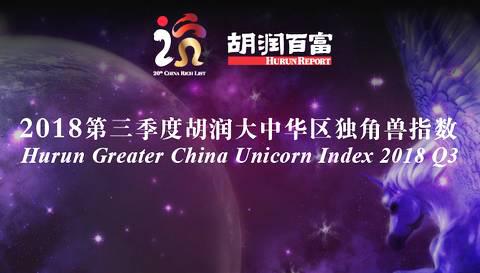 全球最大财富榜排榜机构胡润研究院发布《2018第三季度胡润大中华区独角兽指数》