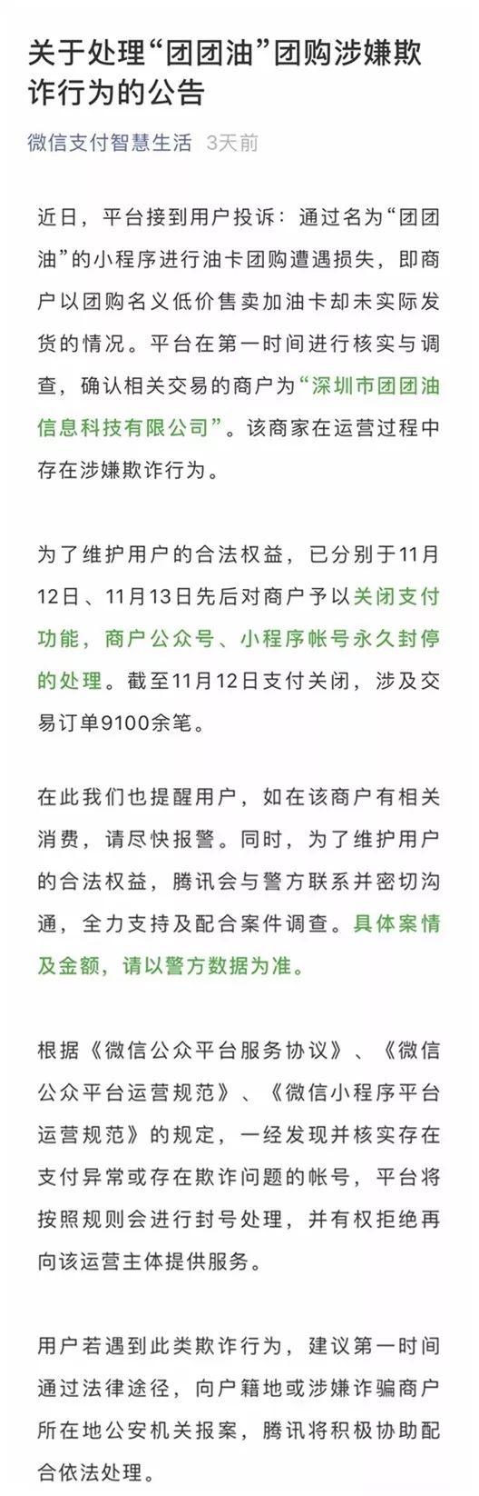 昨天傍晚,腾讯方面发来文字说明,其中称,腾讯对微信小程序帐号的发布审核,有一个系统的验证审核流程,会对主体的真实性、名称的合规性、代码的合规性等进行审核。经核实,“团团油”小程序在提交申请时,其主体公司所提供的工商营业执照真实存在,其它资质等资料也均符合规定。同时,按要求提供了企业资质,并完成了对公打款、核实授权真实性等的步骤。腾讯在发现并核实该帐号在运营中涉嫌欺诈后,为了维护用户的合法权益,已分别于11月12号、13号先后对商户予以关闭支付功能,商户公众号、小程序帐号永久封停的处理。截至11月12日支付关闭,涉及交易订单9100余笔。