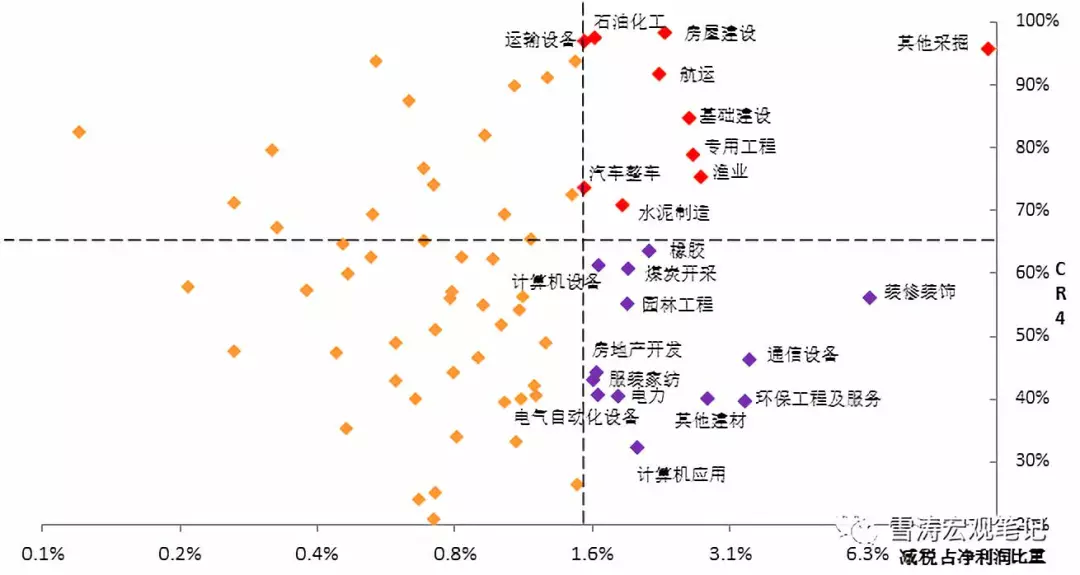 行业集中度刻画了行业的竞争格局和垄断程度,一般来说行业集中度越高对应行业垄断程度越高,意味着该行业里的头部企业对上下游行业的议价能力越强。我们将上市公司按申万二级行业分类,以全年营业收入为参考计算各行业的CR4(行业里营收最大的4家企业占全行业营收的比重),结合增值税减税占行业净利润的比重(假设16%档下调至14%),绘制散点图如下,一般可以认为增值税减税更利好位于右上角的行业。