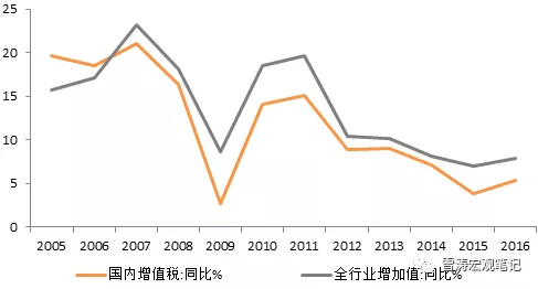 1)以GDP增加值为计税基础:GDP增加值是国民经济总产出价值扣除中间消耗后的余额,增值税的征收基础是商品或劳务在流转过程中实现的增值额,因此理论上,增值税的征收对象就是增加值,二者具有一定的一致性,可以看到近十年,增值税增速和GDP增加值增速虽在数值上略有区别,但是趋势上高度一致(2015-2016年的增值税数据因营改增做了修正)。各行业增加值数据更新至2016年,假设近两年经济结构无显著变化,可以用行业增加值占比近似增值税税基占比,结合相对应的税率,估算出三档增值税率的行业贡献占比。结果显示,16%/10%/6%三档税率对应的行业增值税比例约为54%/26%/20%;