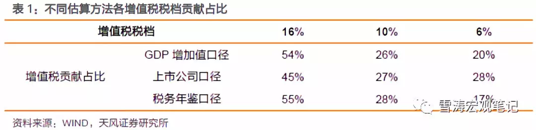 综合上述三种方式的估算结果,我们估计16%/10%/6%三档税率对应行业贡献增值税比例约为54%/27%/19%。
