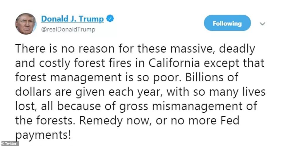 “没有理由可以解释加州这些大型的、造成死伤的、花费巨额的森林火灾,除非那里的森林管理很糟糕。每年数十亿的钱都花在拯救山火上,这么多生命因大火丧生,都是因为森林管理不当造成的。现在就补救,否则再也不给你们联邦拨款了!”