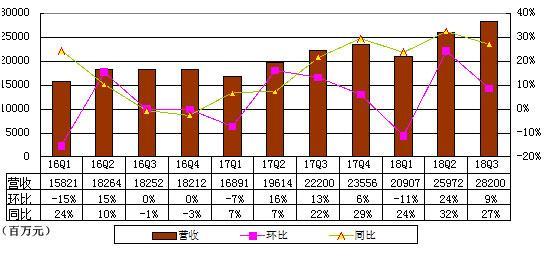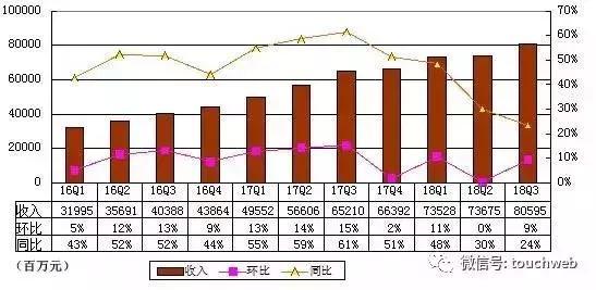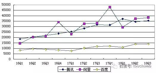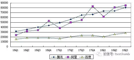 2018年第三季度,腾讯和阿里单季营收都突破了800亿元,百度营收达到282亿,但在下一个季度,百度营收又会大幅回落。