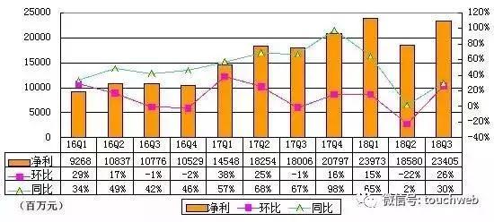 腾讯的利润最高,腾讯第三季度期内盈利234.05亿元(34.02亿美元),比上年同期增长30%;净利润率由上年同期的28%上升至29%。