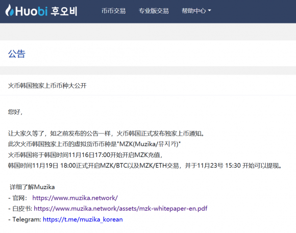 原标题:火币韩国交易所重要升级 联合首家上币项目MZK熊市突围