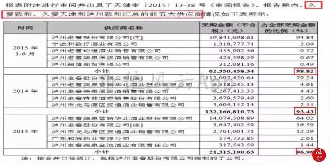 其中,3家标的公司汇总的前五大供应商中,公司向泸州老窖的采购比例高达99%,泸州致和与泸州老窖之间的关联关系在被深交所问询后才予以承认。