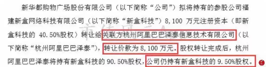 另外,作为创新门店业务拓展设立的新盒公司,因对未来经营预期的不乐观,2018年9月28日,公司把所持新盒网络科技公司的50%的股权,转让给关联方杭州阿里巴巴40.5%,自己仅留下9.5%的股权。