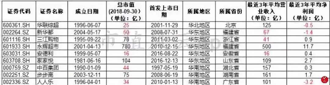 在9家商超零售企业中,新华都截止至9月30日的市值,以50亿的市值排名第5;最近3年平均营业收入为67亿,未过百,排名倒数第3,平均净利润为亏损1.4亿,排名倒数第2。