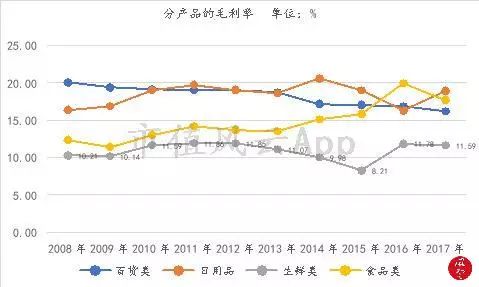 从分产品的毛利率来看,公司的生鲜产品毛利率在近2年虽然有所上升,但是仍然是垫底的,而且,公司在2011年最高的毛利率11.86%较永辉的最低毛利率还要低。