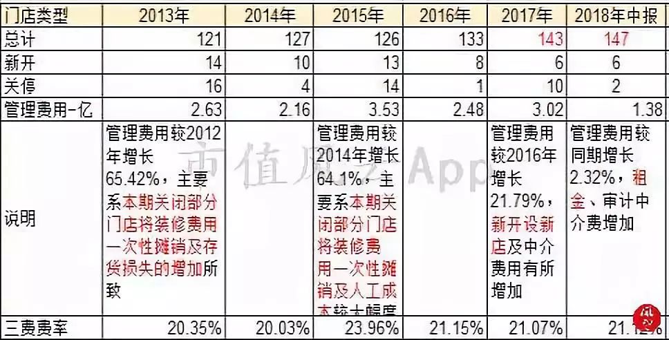在公司毛利率与行业平均毛利率相差不大的情况下,公司的净利率有3期都是负数,各期均是远低于行业平均,造成该现象的是从2013年开始,公司门店的开店成本、关店损失以及租金费用大量增加所致,也体现了公司的门店管理水平、费用管控水平是拖垮公司的重要原因。
