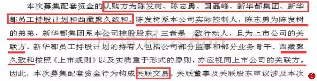 同时,向实控人陈发树、陈发树的弟弟、控股股东新华都集团以及西藏聚久致和等一系列关联方,发行股份来募集此次收购的配套资金,因此此次收购又是一笔关联交易。