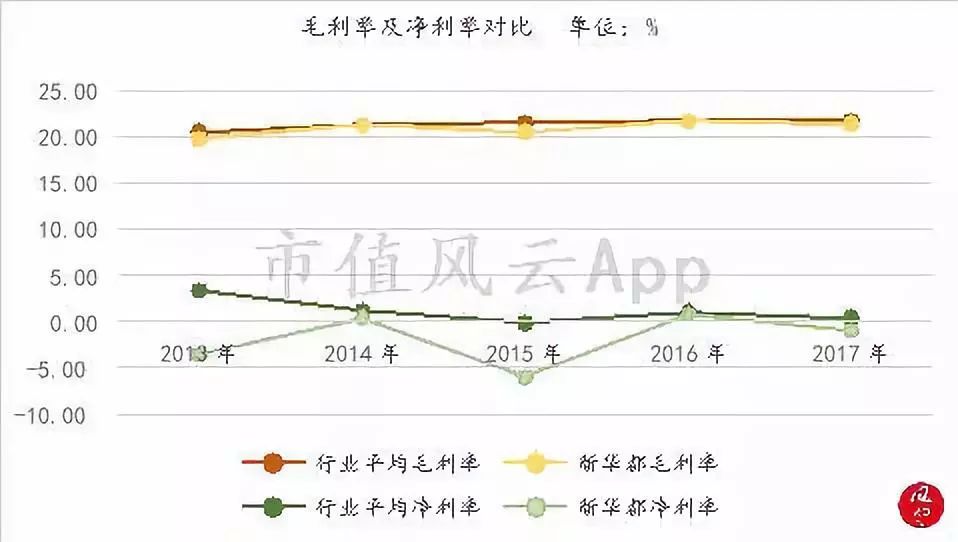 风云君选取了上市以来的业绩数据,可知伴随着行业营收增速总体下滑的情况,新华都近年来最高的营收都只是在70亿左右徘徊,2013年公司营业收入达到上市10年来的顶峰——73.8亿。但是从2014年开始,公司的营收规模就开始下降。2016年、2017年伴随着外延并购、线下零售的复苏,营收有小幅增长。