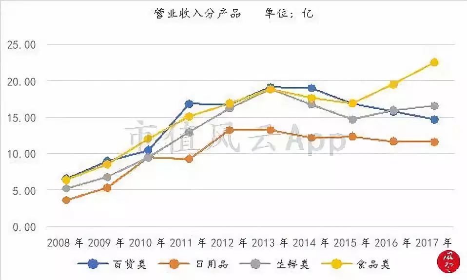 在产品结构方面,公司销售产品主要分为百货、日用品、生鲜及食品四类。近两年,线下生鲜零售被电商巨头及各资本追逐,公司的产品结构也随之有所调整,由原来的百货及食品居多的格局,发展成以生鲜及食品较多的产品结构。