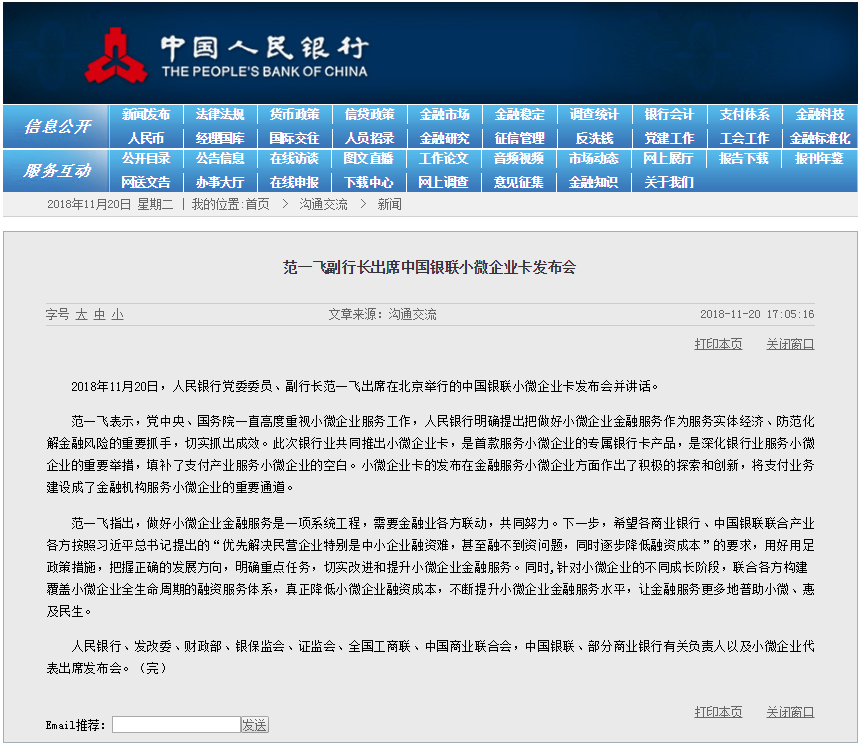 2018年11月20日,人民银行党委委员、副行长范一飞出席在北京举行的中国银联小微企业卡发布会并讲话。